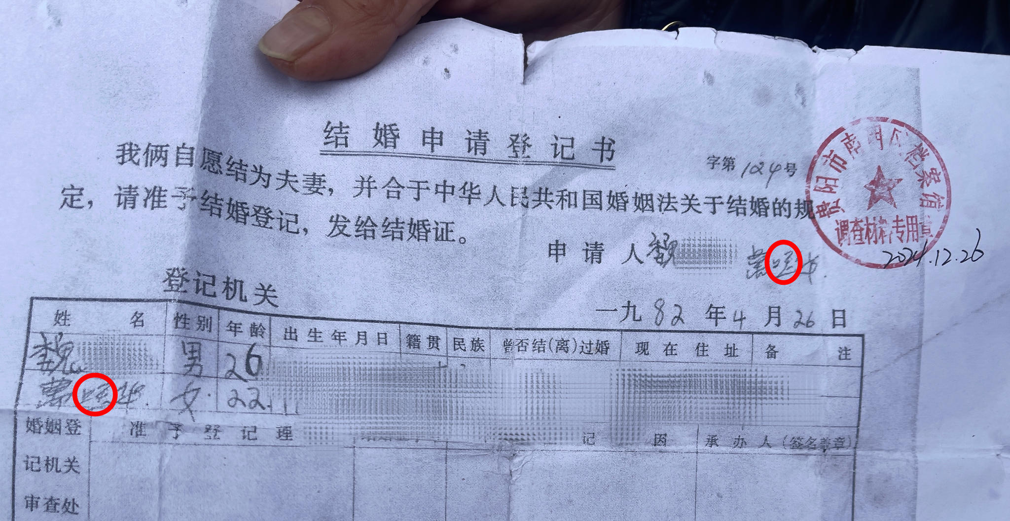 原来,万阿姨原名叫万国华,万阿姨说,他们那个年代结婚证都是手写的,由于当时自己文化程度不高,就把“国”字,写成了左边一个口右边一个玉的错字,因此,现在银行不认可她与老伴的夫妻关系。为了这件事,她跑了多个职能部门,但都无法为她开相关证明,如今,她是心力交瘁。