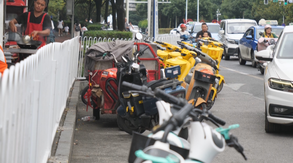 添堵的不只有摩托车、电动车。人行道护栏外的共享单车也来“凑热闹”,一堆堆无序堆放,把行人和上下客的空间挤得更窄了。医院门口本就是上下客密集的地方,车辆没法正常停,只能临时靠路边,结果后面的车也堵上了,形成恶性循环。