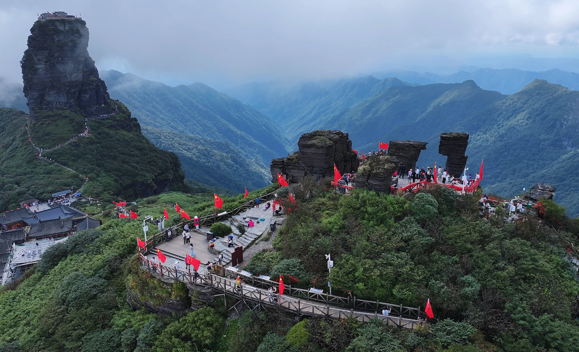 10月1日,世界自然遗产地贵州梵净山景区迎来国庆佳节。景区内外一面面鲜艳的五星红旗迎风招展,在青山云雾的映衬下格外醒目,将浓厚的节日氛围烘托得淋漓尽致,吸引了众多游客在此感受家国同庆的喜悦。