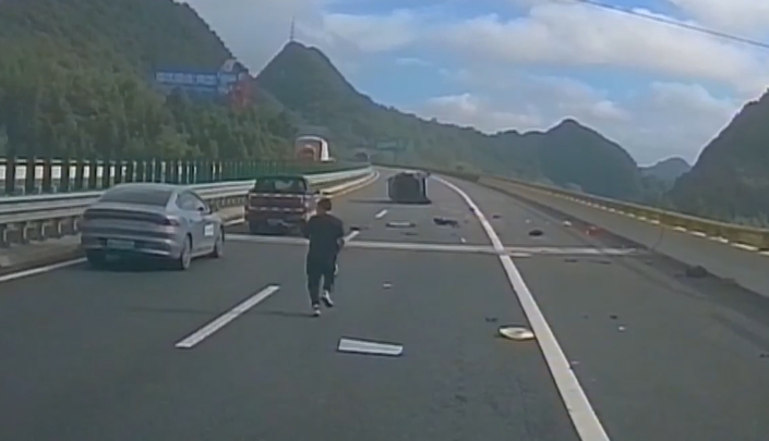 9月28日早上,沪昆高速清镇段发生一起交通事故,一辆面包车突然爆胎失控,车辆侧翻在高速路上,就在这危急时刻,后方一辆车上的驾驶员冲了上去。