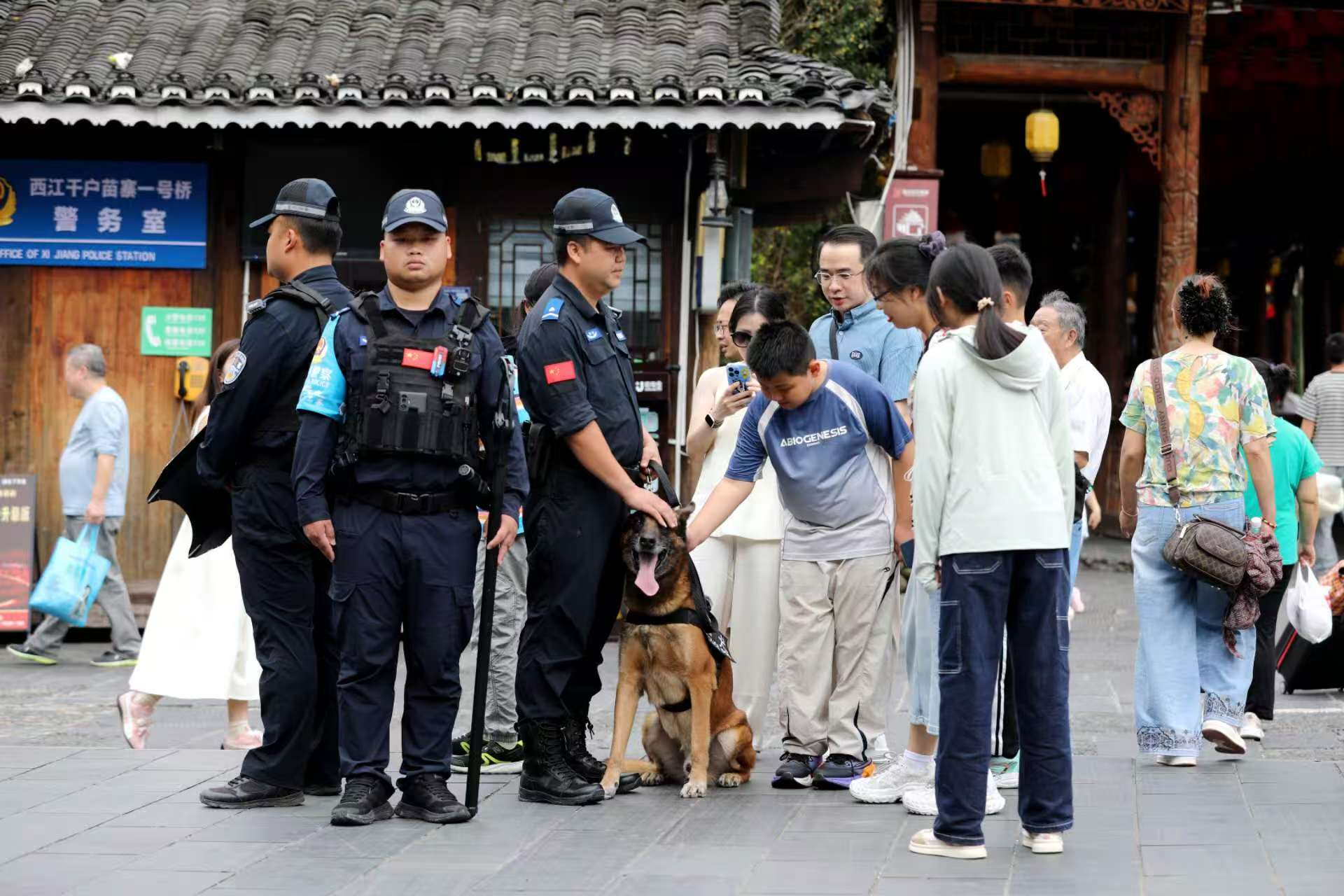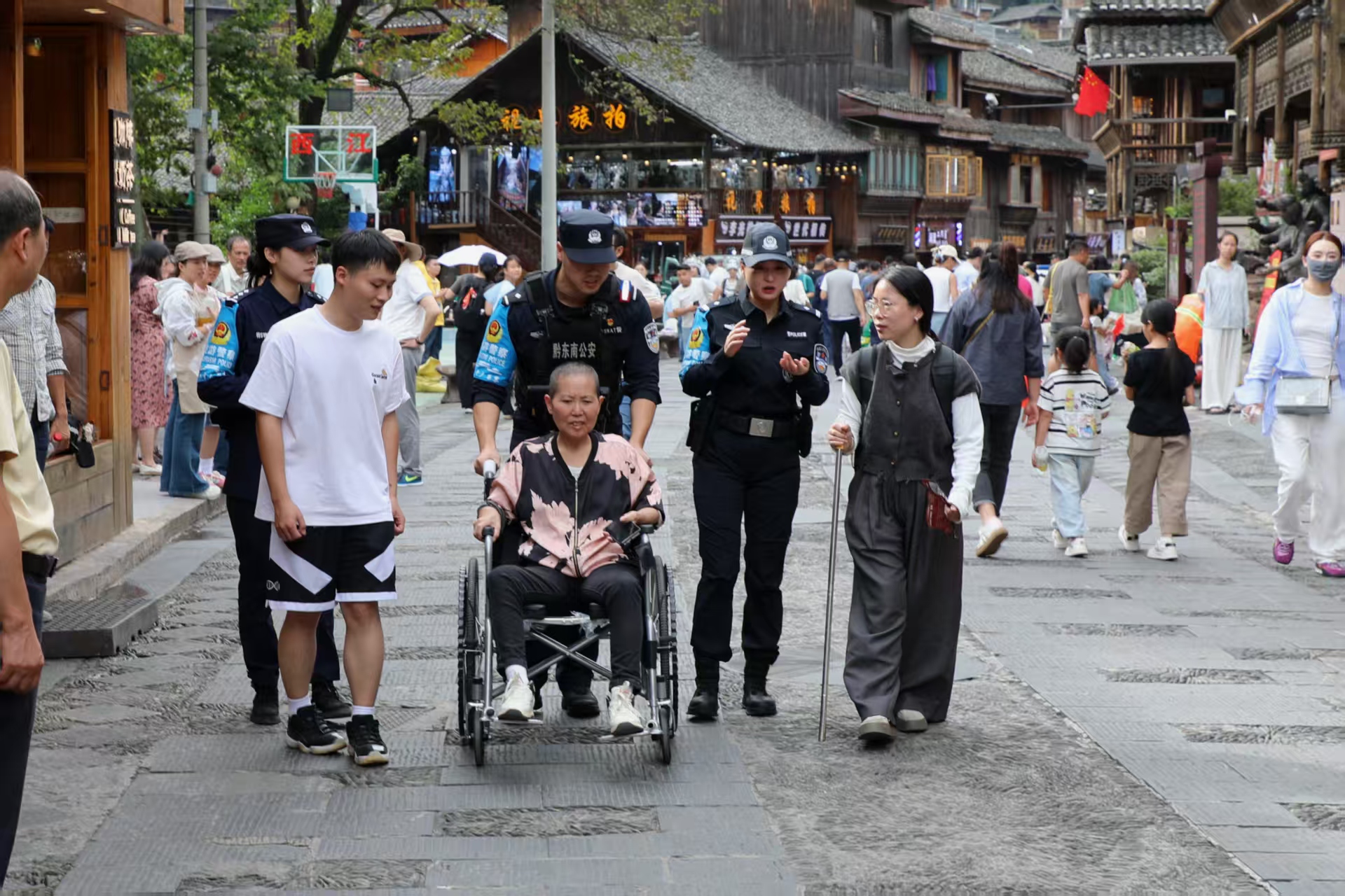 在西江千户苗寨博物馆,州局支援民警敏锐发现,两位游客正吃力地推着轮椅上的老人缓慢前行--因路段略有起伏,加上往来游客较多,三人前行格外困难。民警当即快步上前,主动伸出援手,“您好,看您推着轮椅不方便,这段路有点不平整,我帮您推到前面的休息区吧!”一句贴心问候、一次主动援手,让游客感受到节日里的警民温情;在郎德上寨表演场,一名游客不慎遗失手机,执勤民警通过调取监控、走访排查,仅用1小时便帮其找回。此外,民辅警在景区入口、观光车乘车点、核心景点等关键部位定岗值守,既及时疏导密集人流、防范拥挤踩踏风险,又主动为游客提供路线指引、物品寄存、应急药品等服务,以“护游先护安、护安先护客”的担当,让游客玩得安心、游得舒心。