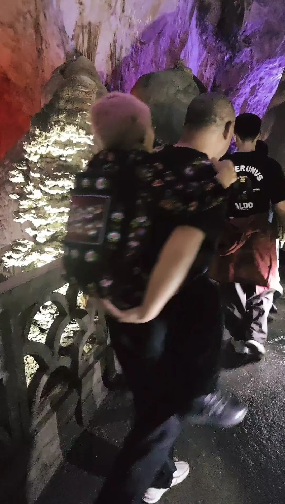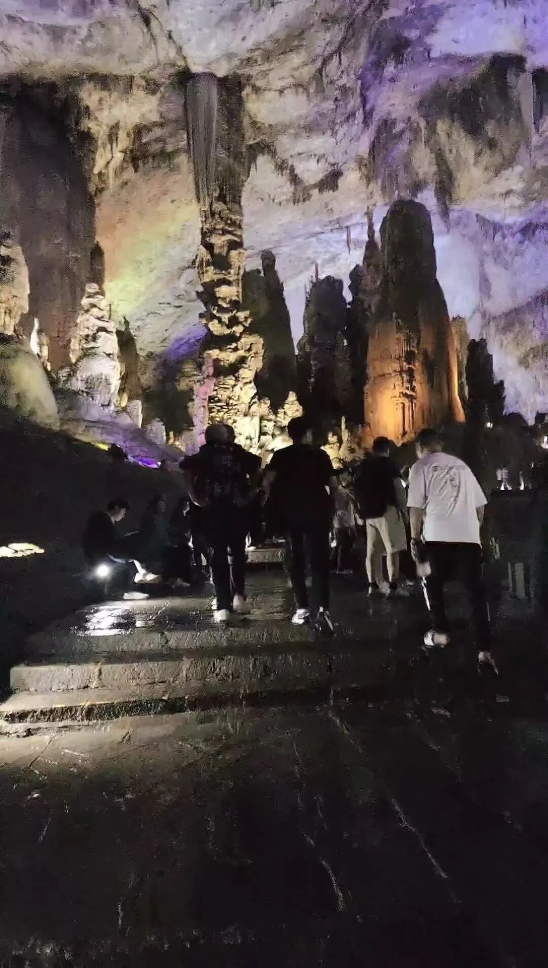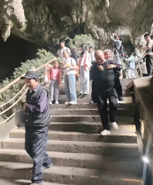 我哥在外省工作,因为他只有节假日的时候才有时间回来,所以就想着带我和妈妈出去玩。我妈的腰不好,走不了,所以他就全程就背游玩织金洞。