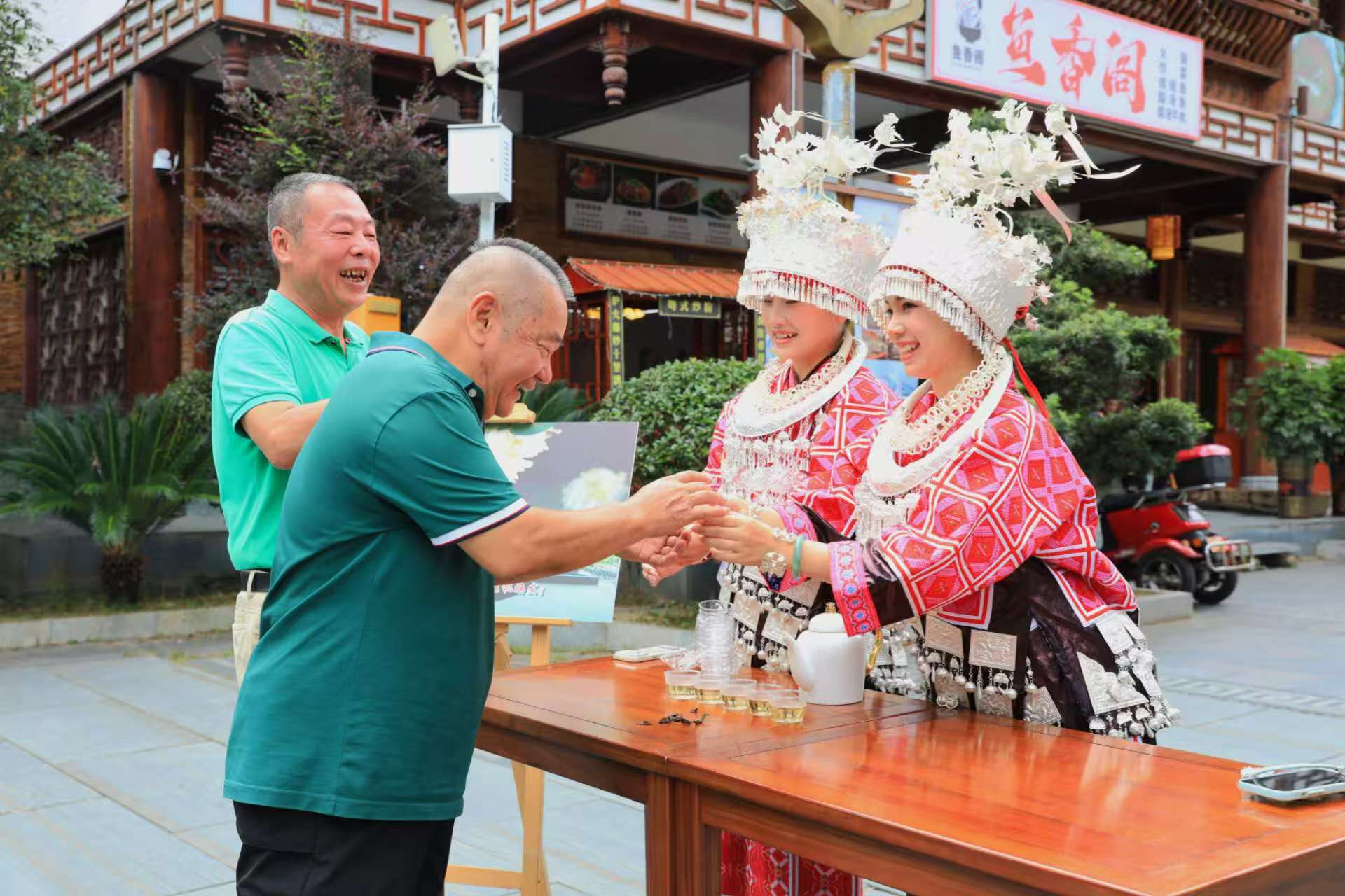 刚抵达小镇大门,浓郁的苗族风情便扑面而来。身着绚丽苗族服饰的工作人员,手捧温热茶壶静候一旁,以独特的拦门迎宾仪式,向每一位入园游客敬上暖心热茶。这一充满民族特色的举动,瞬间拉近了与游客的距离,让初到者倍感亲切。