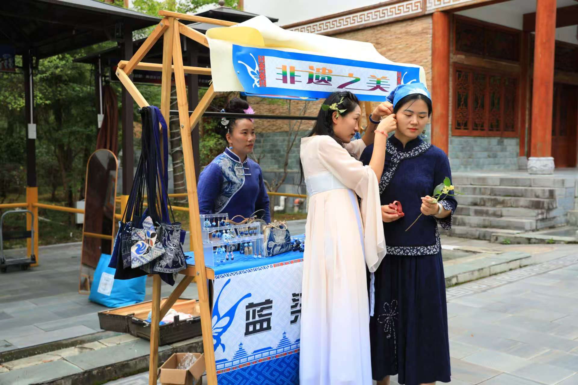 步入温泉商业街,非遗市集无疑是最吸引游客驻足流连的“文化打卡点”。苗族银饰的璀璨光泽、苗侗服饰的精美纹样、苗族特色蓝染以及苗族剪纸的灵动造型——琳琅满目的非遗展品,让游客仿佛走进了一座苗侗文化的“移动宝库”。
