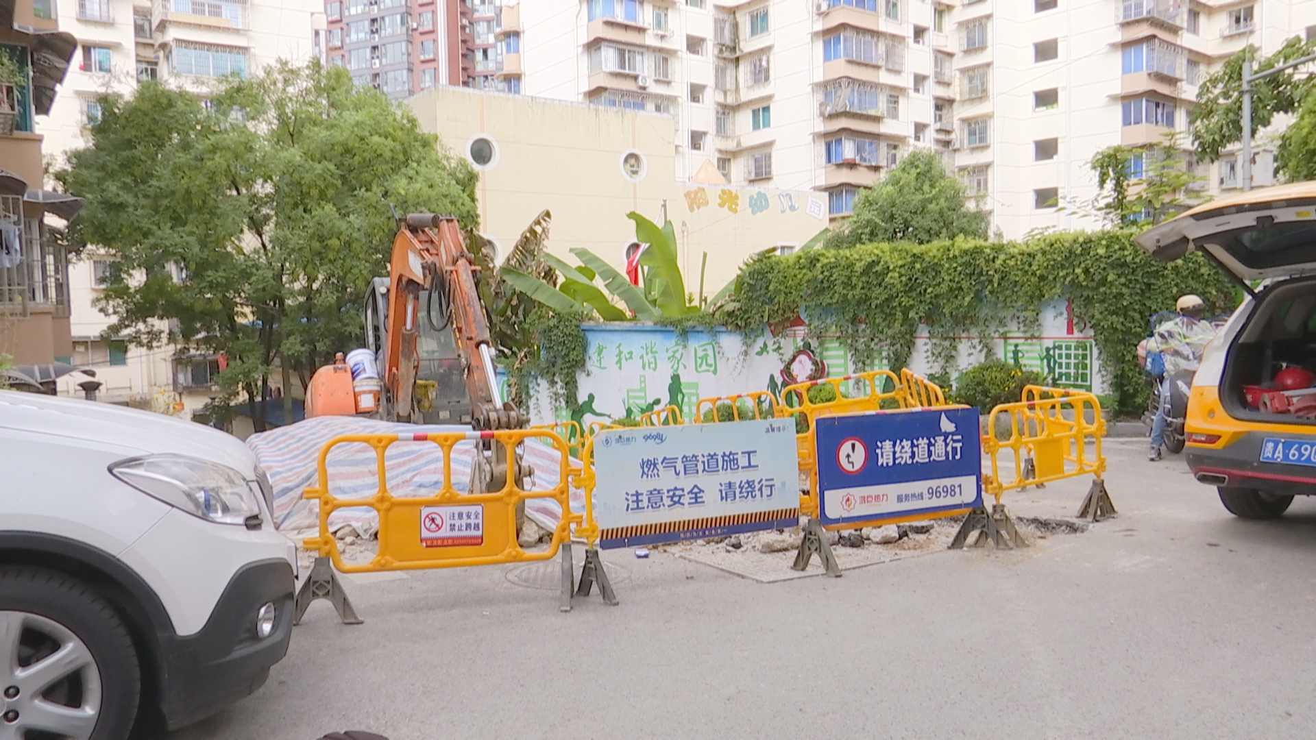 在现场,记者看到了一份贵州鸿巨热力(集团)有限责任公司发布的施工公告,公告上显示的竣工日期是今年7月。周女士告诉记者,她家楼栋前的施工是从10月1号开始的,但是她并没有提前收到信息,所以才导致车被困在了小区里。