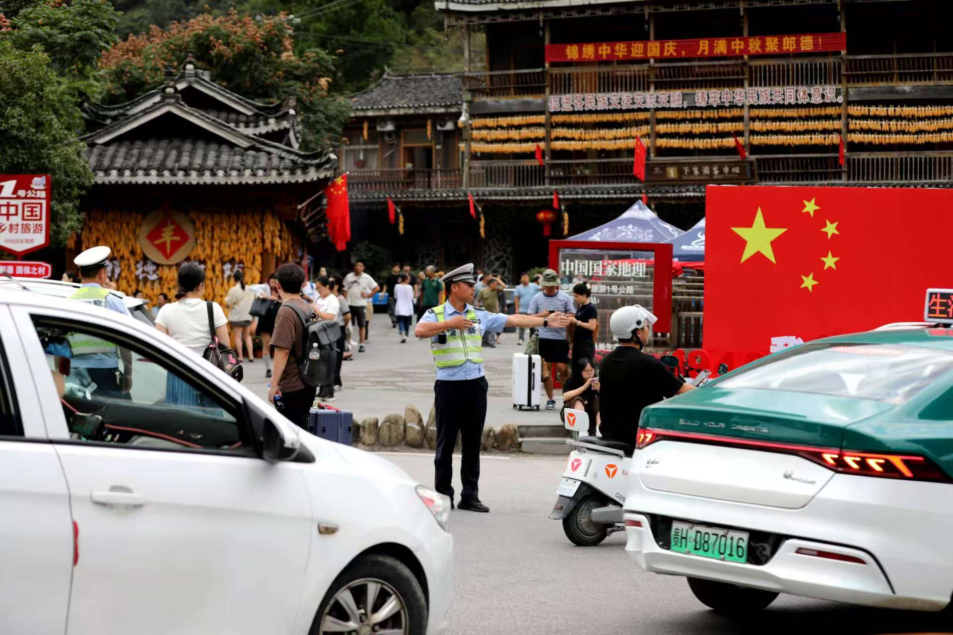 正午时分,郎德景区入口的三岔路和国道主干线迎来车流高峰。辅警罗泽西带着三名同事早已在此值守,四人分工明确,两人站在三岔路引导行人和车辆分流,另外两人沿着国道指引车辆前往停车场和临时停车位。
