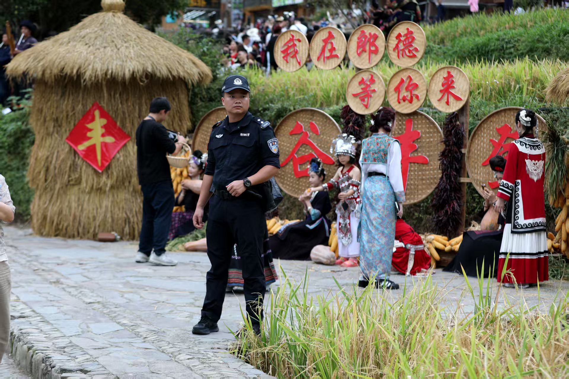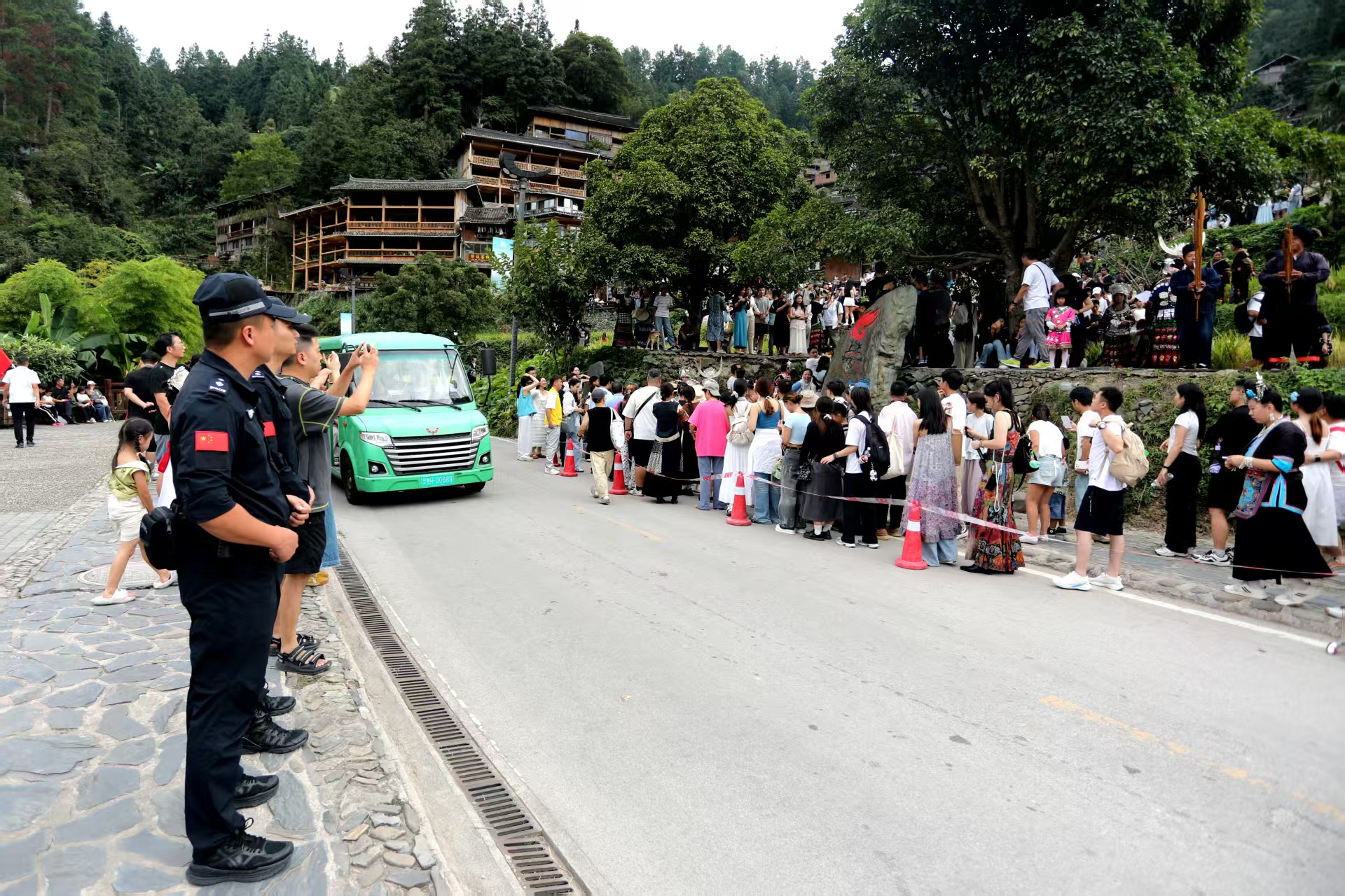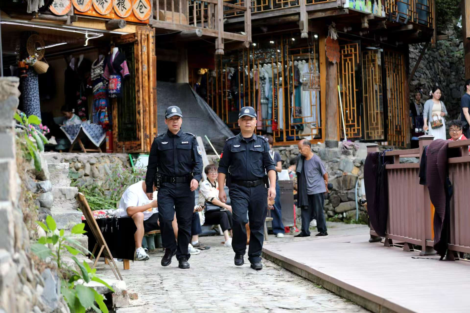 当中秋的月光洒满苗寨鼓楼,国庆的欢歌萦绕稻田埂上,雷山县郎德苗寨迎来了最热闹的双节时刻——十二道拦门酒香气氤氲迎客来,芦笙舞在苗寨中心翩跹起伏,夜间篝火晚会更是点燃数千游客的热情。为守住这份热闹与平安,雷山县公安局全警动员、联动协作,派出所民辅警扎根一线,局机关警力下沉支援,分片包干、紧密配合,让“警察蓝”成为苗寨节日里最安心的底色。