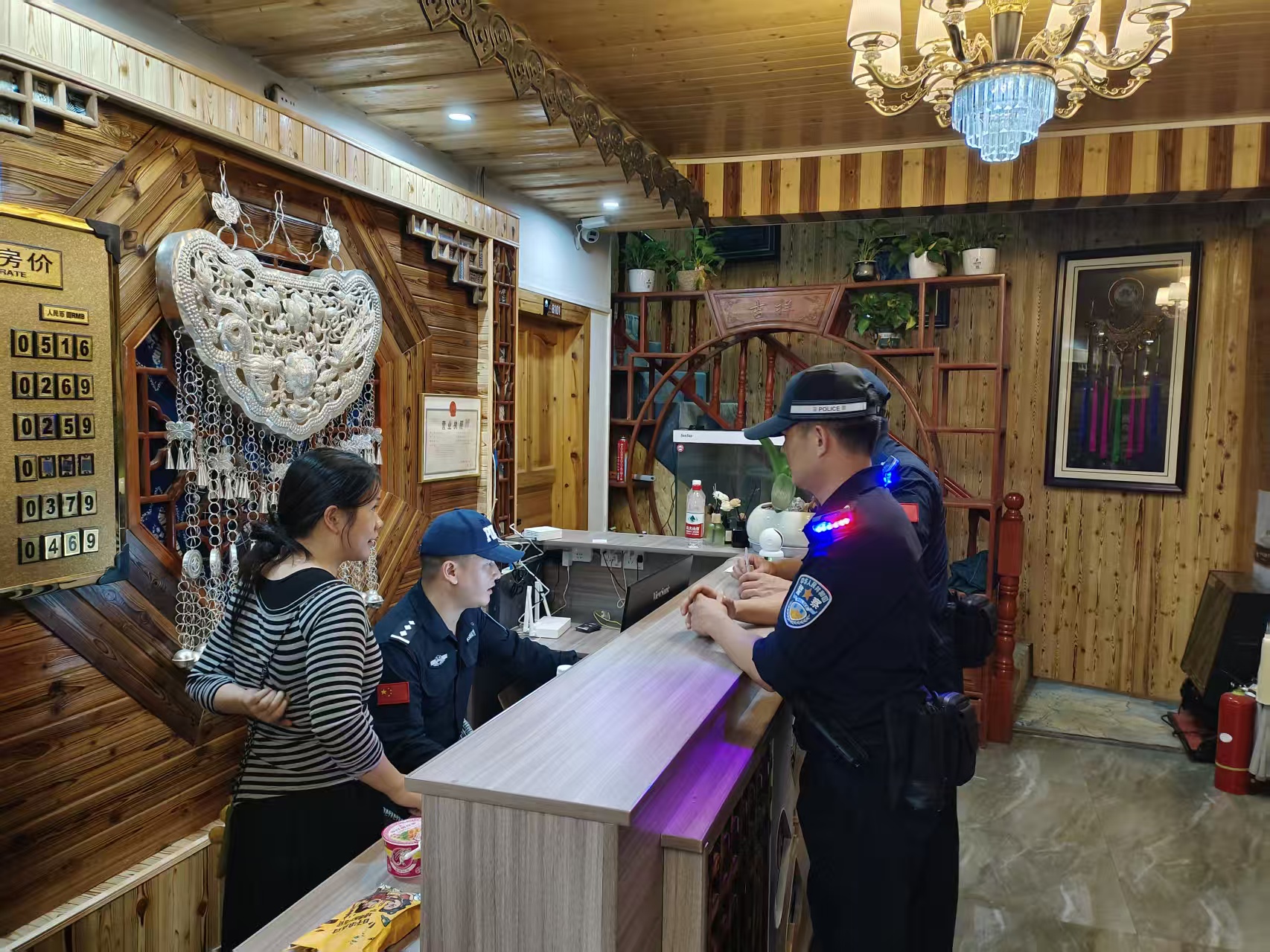 走到一家酒店门口,杨天佑又停下脚步,“节日期间入住率高,安全一点都不能马虎。”他仔细检查了灭火器的有效期,推开消防通道门确认畅通,还翻看着住宿登记台账,“登记信息要齐全,务必落实好身份核验。”前台工作人员连连应下,立刻对照台账补充信息。