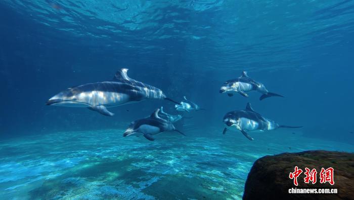 三头新生的太平洋短吻海豚宝宝13日在横琴长隆海洋王国首次与游客见面。它们在海豚妈妈的陪伴下亮相,展现出活泼可爱的身影与日渐娴熟的游泳技巧。