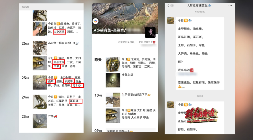 前段时间,记者获取一条线索,有人在微信朋友圈发布售卖国家二级保护鱼类及“三有”动物的信息,并通过私信议价、熟人带货等方式规避监管,形成一条从捕捞、运输到销售的灰色产业链。对此,记者展开了调查。