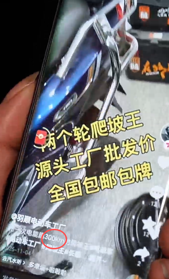 刘师傅:这是我前段时间买的新车,在抖音上买的,当时商家宣传这辆车可以跑200公里。我拿出去才骑两圈就没电了,这个电池才能骑30公里左右。