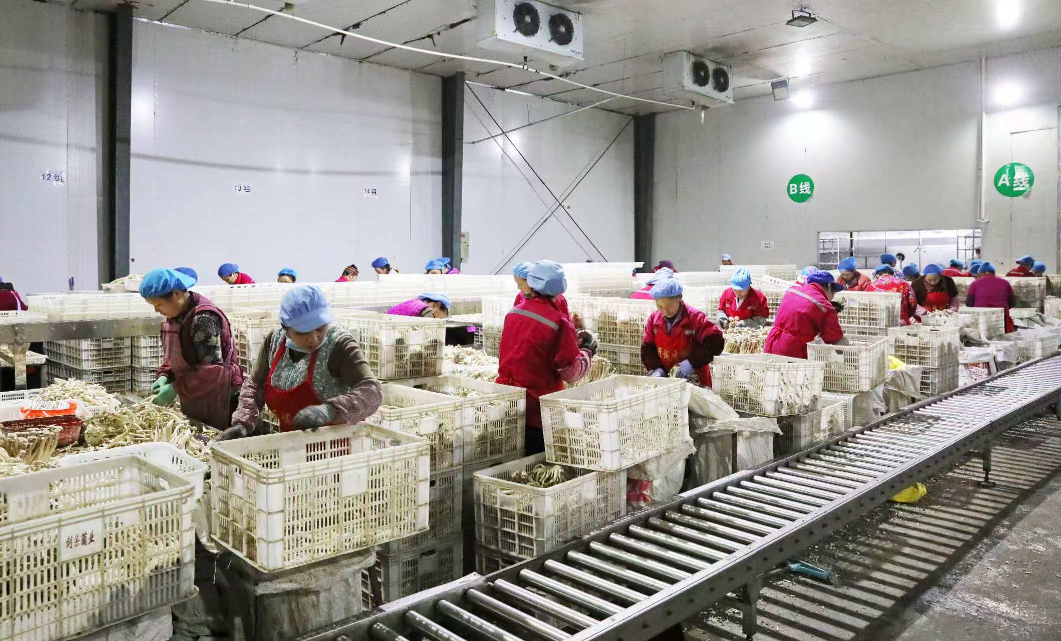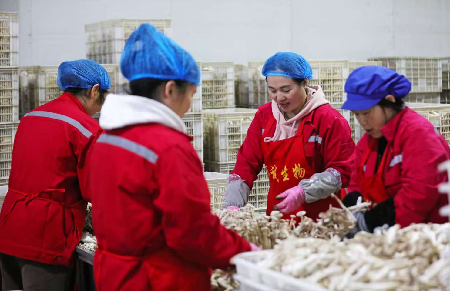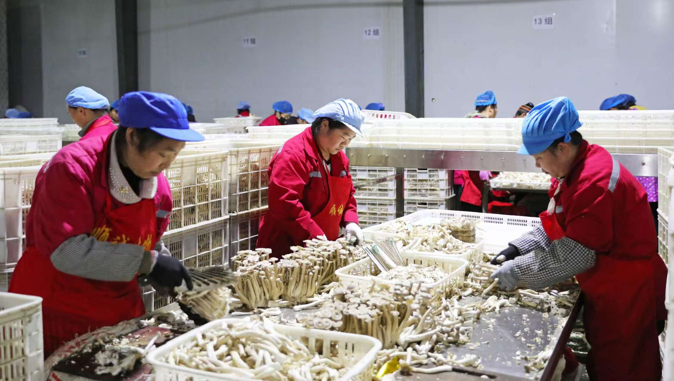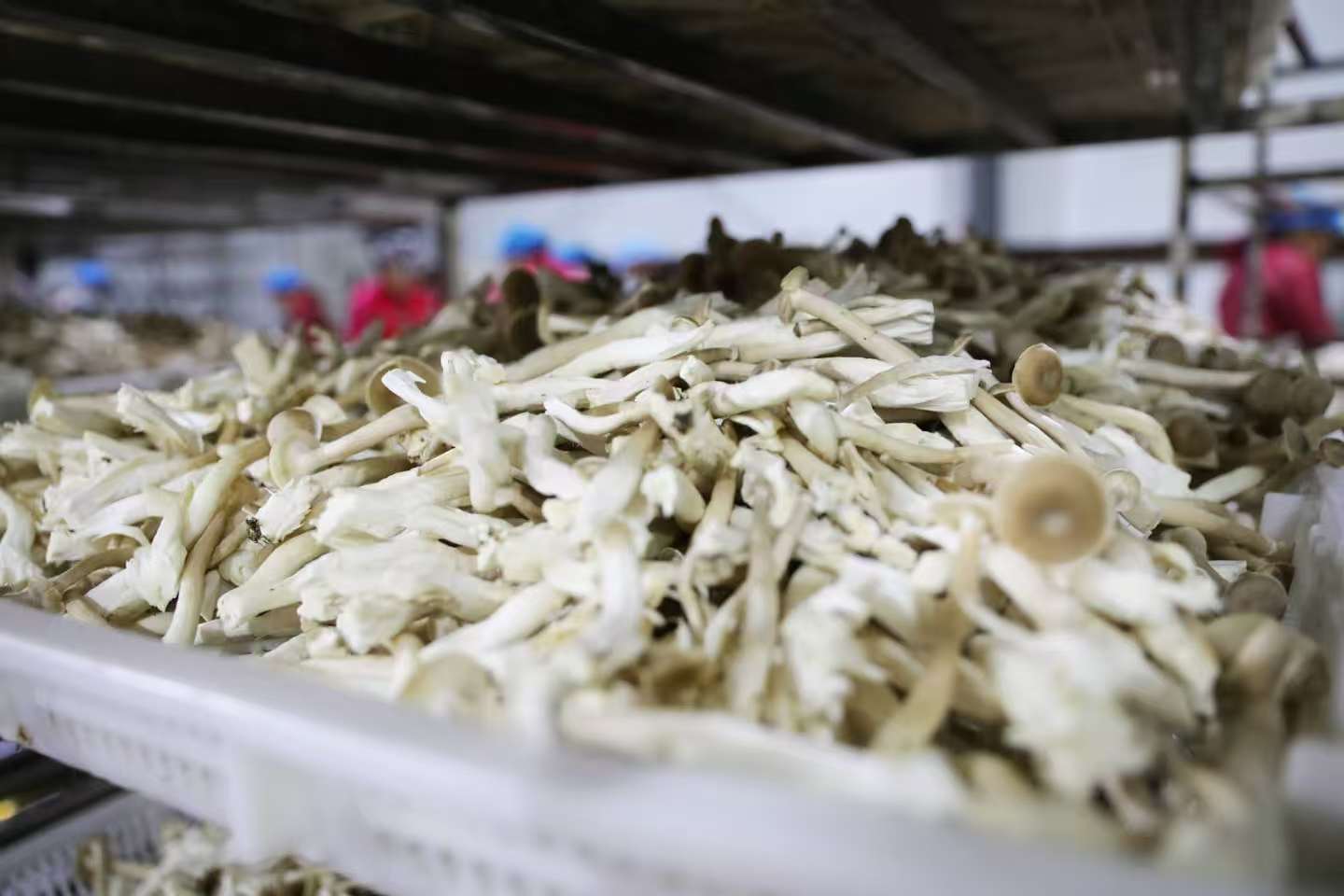 厂房里,制袋车间机械在高速运转,菌棒半成品沿传送带缓缓输出。相邻的出菇房内,菌菇饱满丰盈,工人正在加紧采收。采收后的菌包立即进入包装车间,经历切根、分离、分拣、称重与登记等环节后,继续运往下一个车间进行加工。工人们在自动化生产线旁娴熟地操作,从菌棒制作到鲜菇采收,各道工序都有条不紊。
