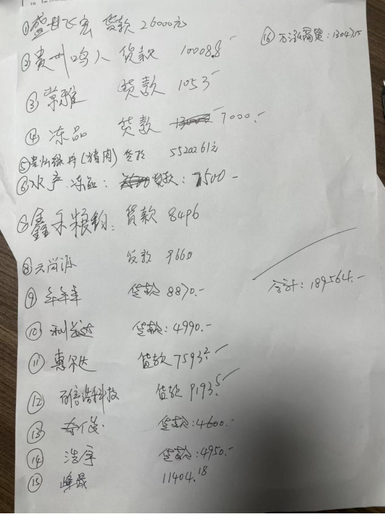 发现了这家超市的异常后,经销商们罗列了一份欠款清单,上面共有十六家供货商的欠款明细,每家从几千到几万块钱不等,总计约有18万元。
