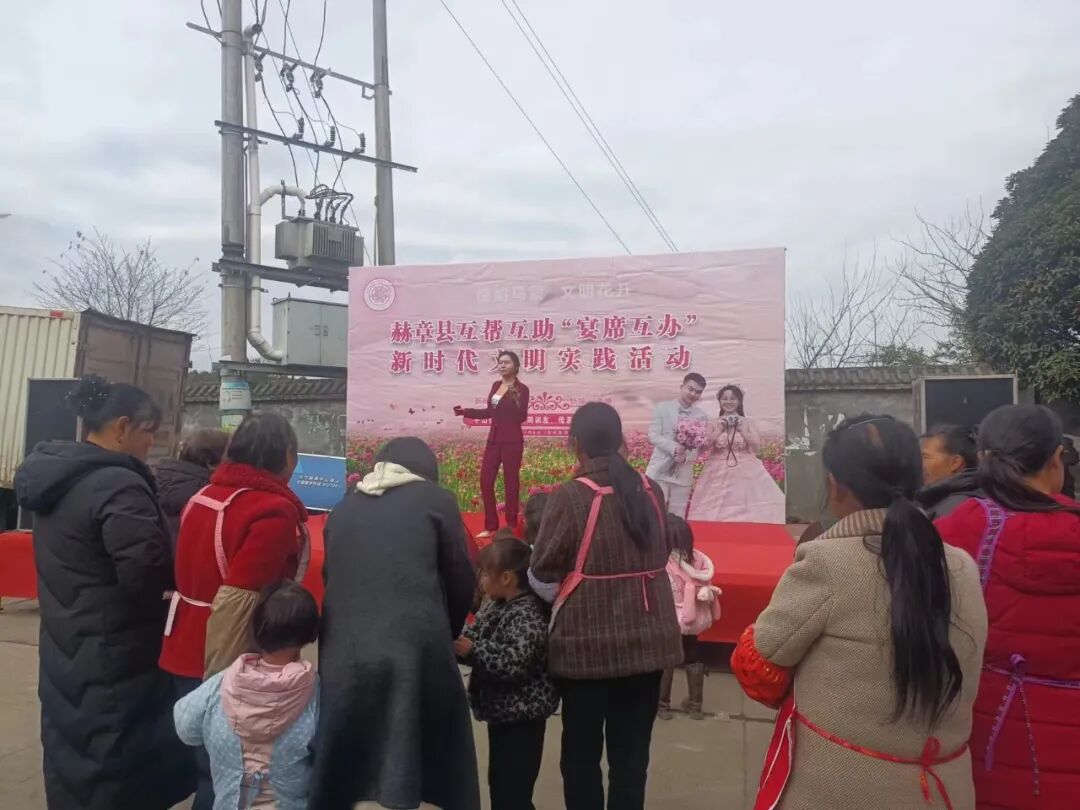 互帮互助“宴席互办”活动现场,粉色的主题背景板格外醒目,“德韵乌蒙 文明花开”的标语与“宴席互办”的活动主题相互映衬。通过知识抢答的形式,让群众直观感受到“简办宴席、互帮互助”的好处。不少村民围聚在一起,认真聆听政策解读,交流着参与互助宴席的体验,现场氛围热烈又温馨。