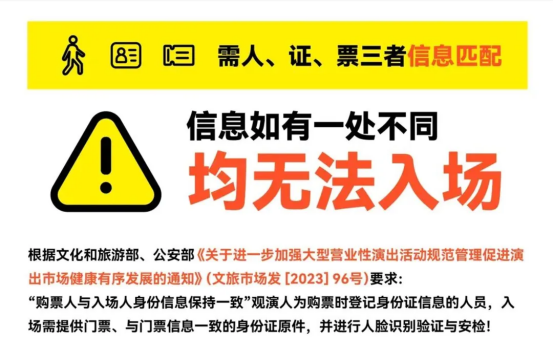 ① 本次演出为实名身份证件入场。进场需携带本人购票时提供的对应观演人员有效身份证件一致的身份证件原件进行验票与安检。验票时将对入场观演人的人脸、证件以及购票订单的观演人信息进行比对,全部信息确认一致后方可入场,对号入座;