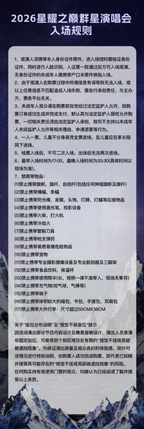 请提前准备好证件:观演人需携带与购票时提供的对应观演人有效证件一致的身份证件原件进行验票与安检,同时人脸识别通过后方可入场,更换及冒用他人身份证件无法入场;提前熟悉演唱会现场平面图,有序安检落座,平面示意图如下👇