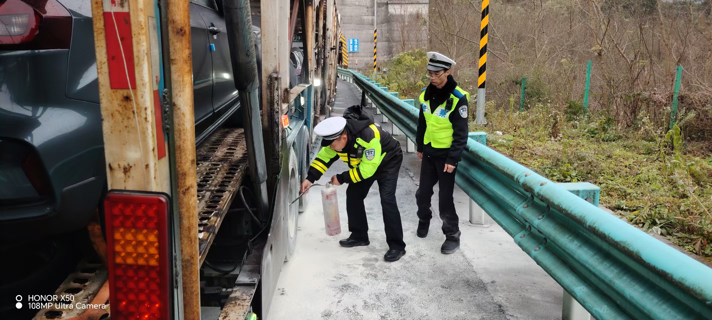 1月21日,遵义高速交警在巡逻中发现一辆半挂牵引车的后轮突发火情,司机因视线受阻全然不知,交警一路喊话追赶、紧急处置,成功保住车上180万元货物,避免了重大事故发生。