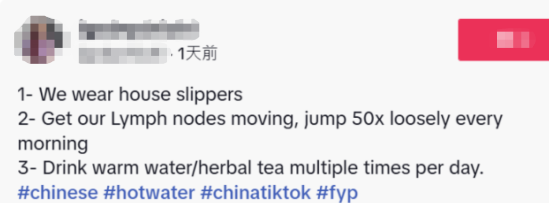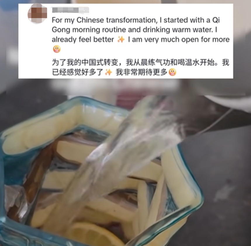 最初的跟风模仿挑战,迅速演变成一场吸引无数海外网友沉浸式参与的狂欢。外国网友纷纷在社交媒体上晒出自己喝热水、煲汤煮粥的日常,还有的网友在家蹬上了新买的棉拖、美滋滋泡起了枸杞……