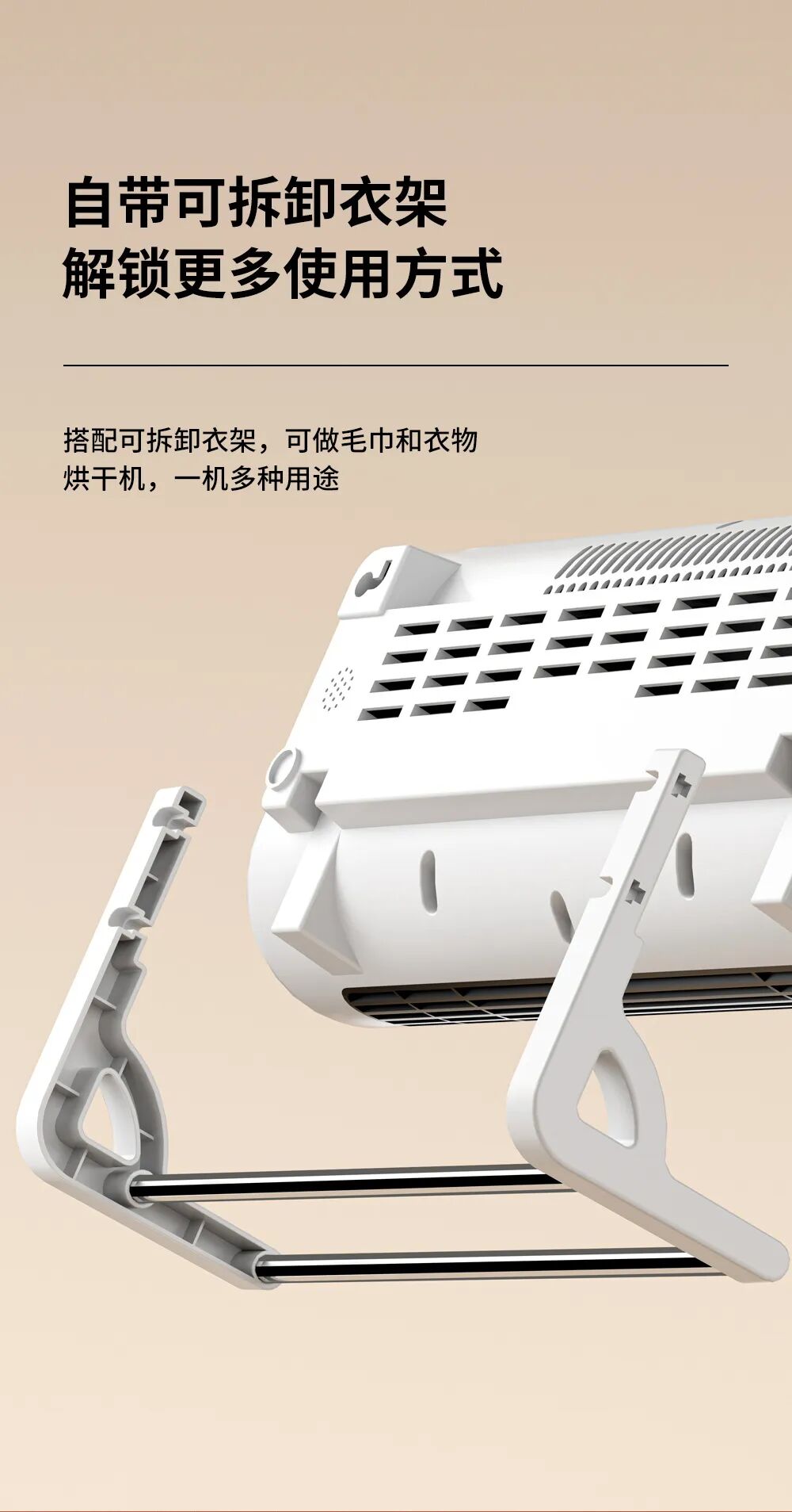 贴心附赠可拆卸衣架,取暖之余还能当毛巾、衣物烘干机,梅雨季、阴雨天快速烘干衣物,一机多用超实用。