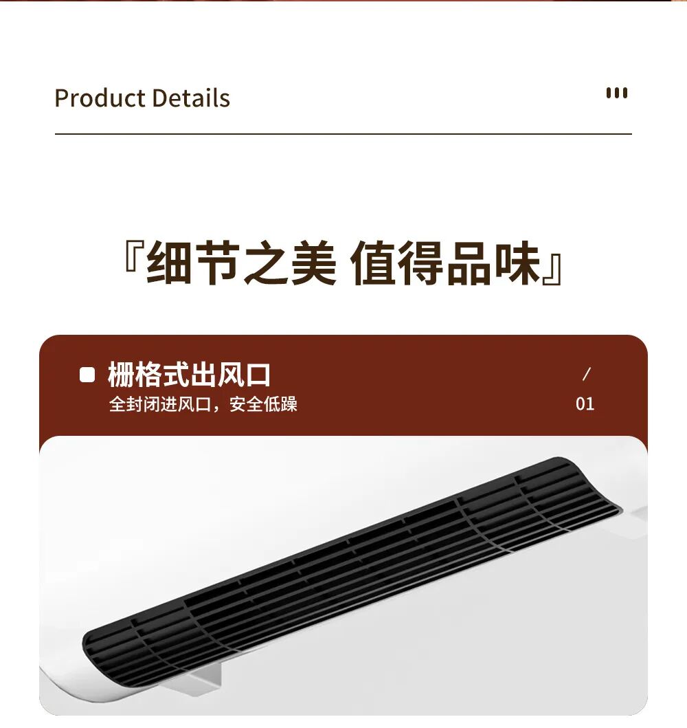 栅格式出风口搭配全封闭进风口,不仅散热均匀,还能实现立体循环风,让热空气均匀对流,整屋升温无死角,低噪运行不打扰休息。