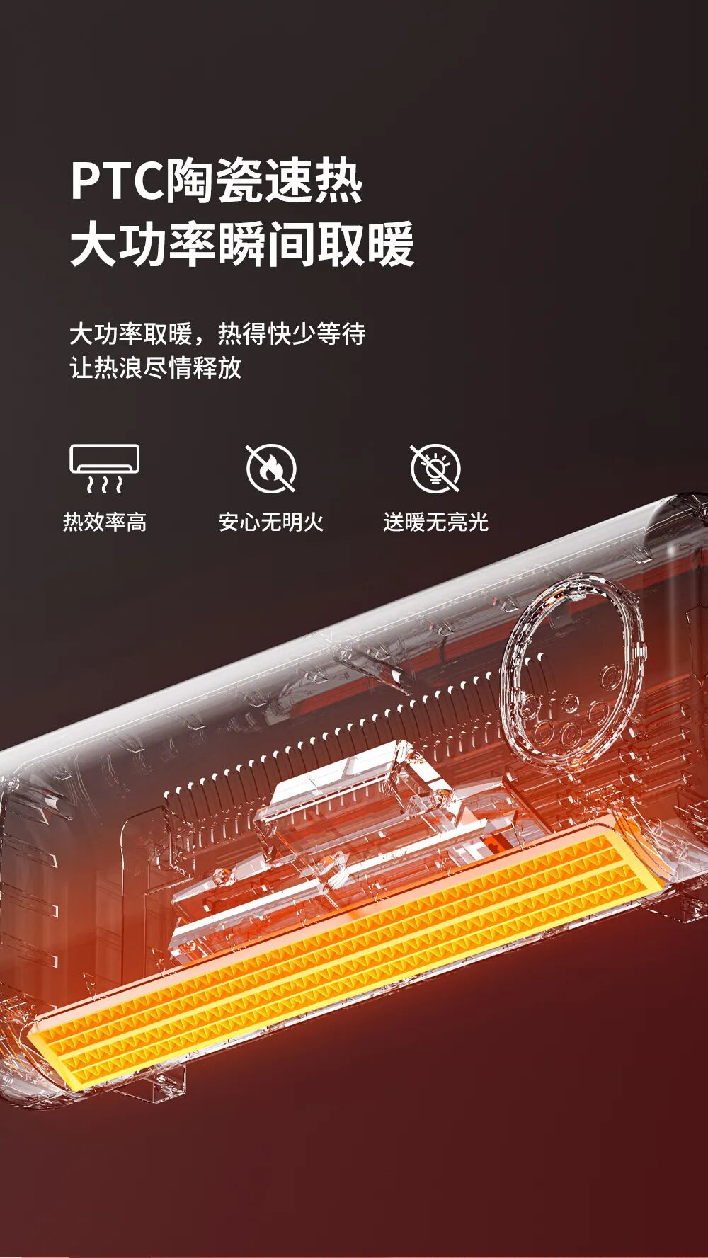 核心黑科技PTC陶瓷速热,大功率驱动下热浪瞬间释放,无需漫长等待,开机即刻拥抱暖意。