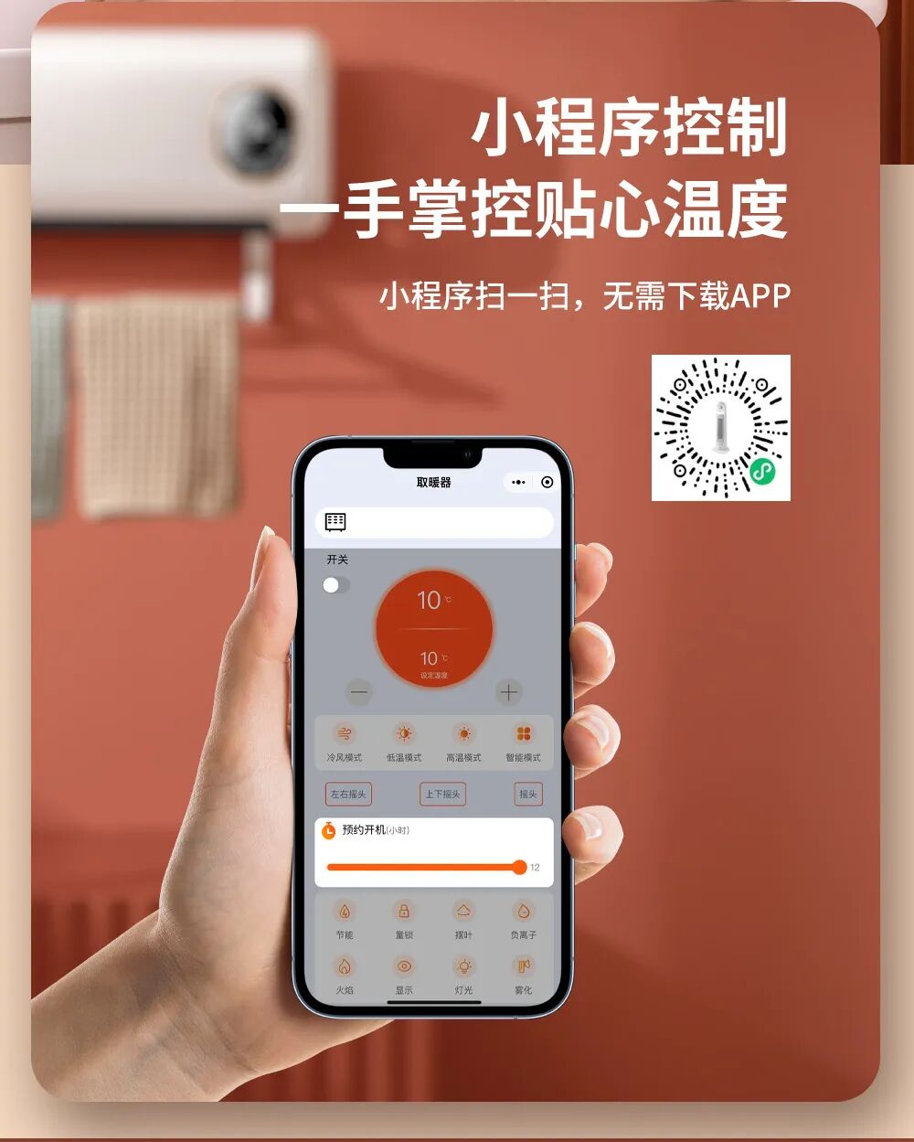 无需下载APP,智能语音控制+小程序远程遥控双模式,躺沙发上、躺在床上就能轻松调档、控温。