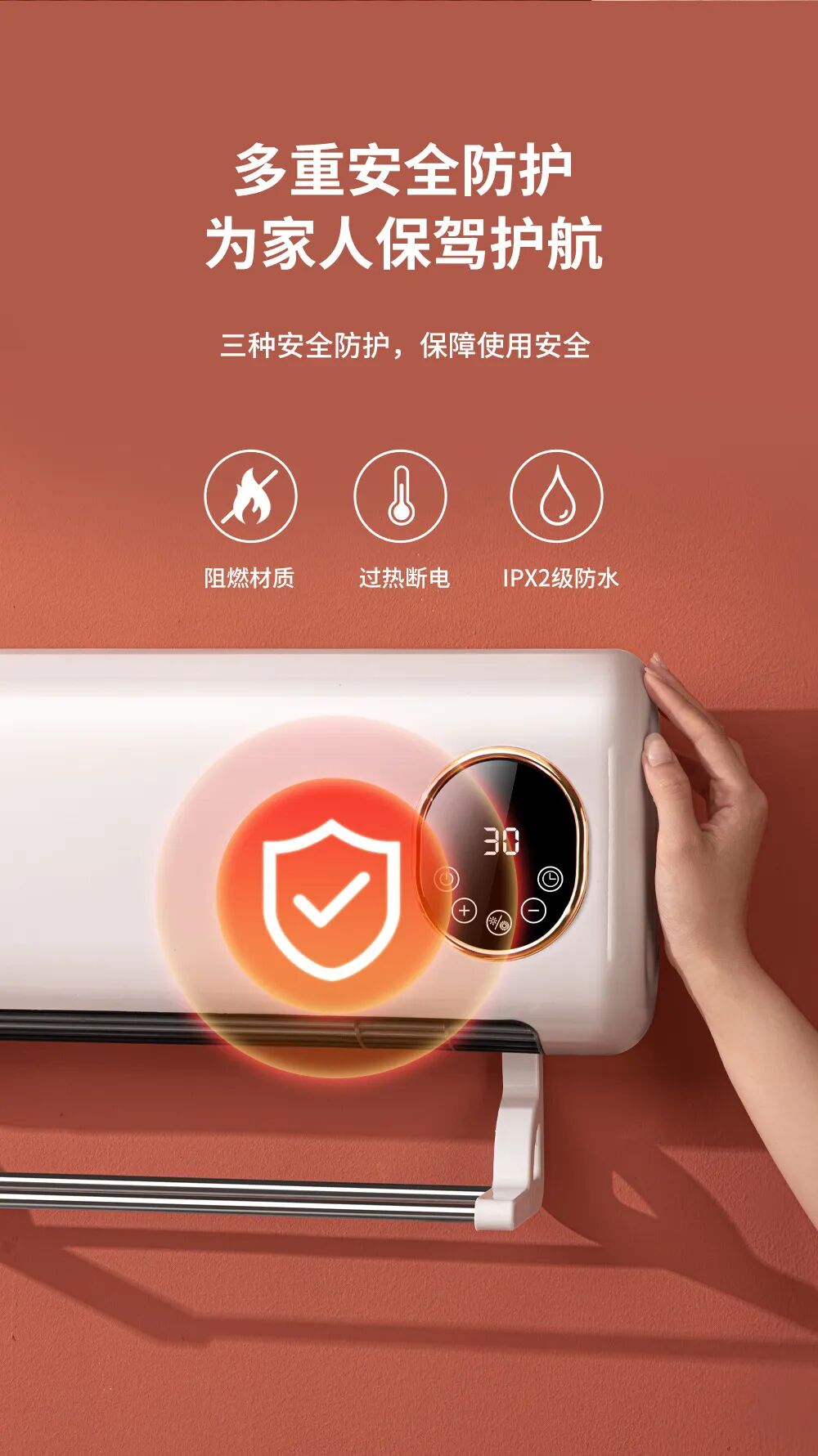 IPX2级防水设计,无惧浴室水溅,洗澡时也能安心取暖;阻燃材质外壳+过热断电保护,从源头杜绝安全隐患。