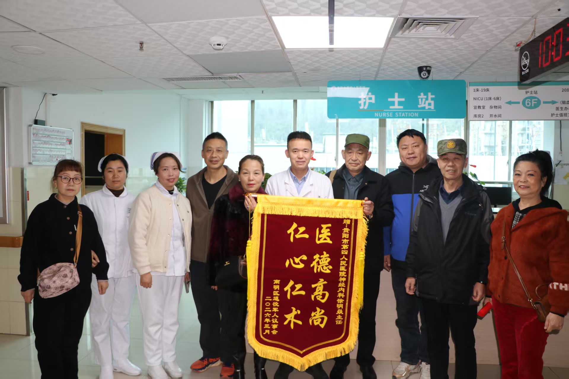 3月19号上午,贵阳市第四人民医院门诊大厅内暖意融融,几名退役军人和家属相约而至,他们带着鲜红的锦旗和诚挚的谢意来到了神经内科,将一面印有“医术精湛祛病痛 仁心医德暖人心”的锦旗送到神经内科徐明焱主任手中,致谢其精湛医术与贴心服务。
