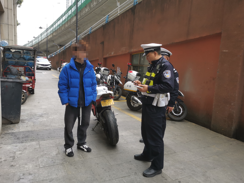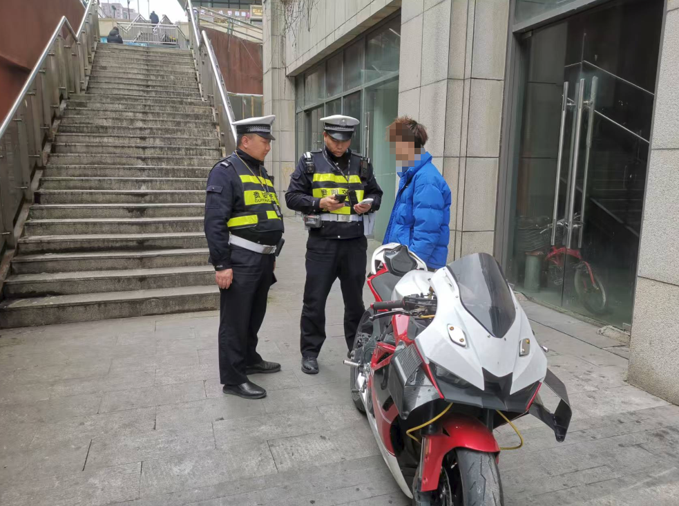 3月17日上午8时许,正值交通早高峰时段,贵阳市南明区交警七中队的民警任海在花果园开展路面巡逻,在惠隆路海豚广场附近时一阵刺耳的机动车轰鸣声引起了他的注意,循声望去见斑马线处有一辆摩托车,不少群众因排气管音浪太强驻足侧目。