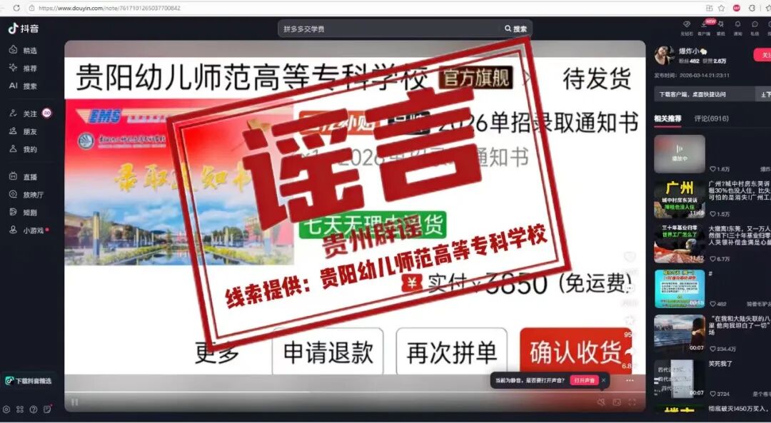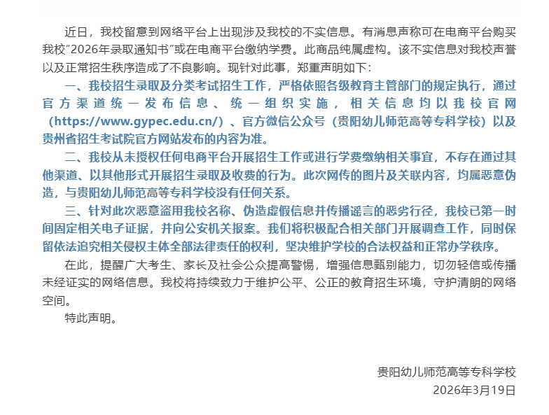 近日,网络上出现有关贵阳幼儿师范高等专科学校的虚假招生信息,声称可通过电商平台购买该校“2026年录取通知书”或在电商平台缴纳学费。对此,贵阳幼儿师范高等专科学校于3月19日通过官方渠道发布严正声明,明确指出该信息不实,并就此事向公安机关报案。