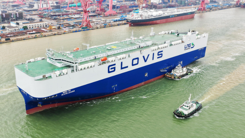 3月31日,中船广船国际为韩国HMM公司建造的10800车LNG双燃料汽车运输船(PCTC)1号船出海试航,这是目前全球在建的首艘万车级双燃料汽车运输船。据了解,该船体总长230米,型宽40米,结构吃水10.5米,航速约19节,在高效运输与稳定航行间实现完美平衡。