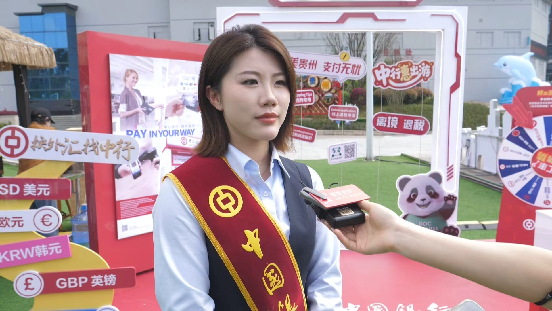 中国银行贵州省分行 个人金融部 产品经理 伍思懿:“我们的外币兑换是可以提供多币种兑换服务,同时可以配备人民币零钱包,方便外籍人士兑换后直接使用零钱消费。我们在现场开展“汇率猜猜猜”大转盘活动,通过趣味互动吸引来宾关注,在轻松氛围中了解外币汇率知识。”
