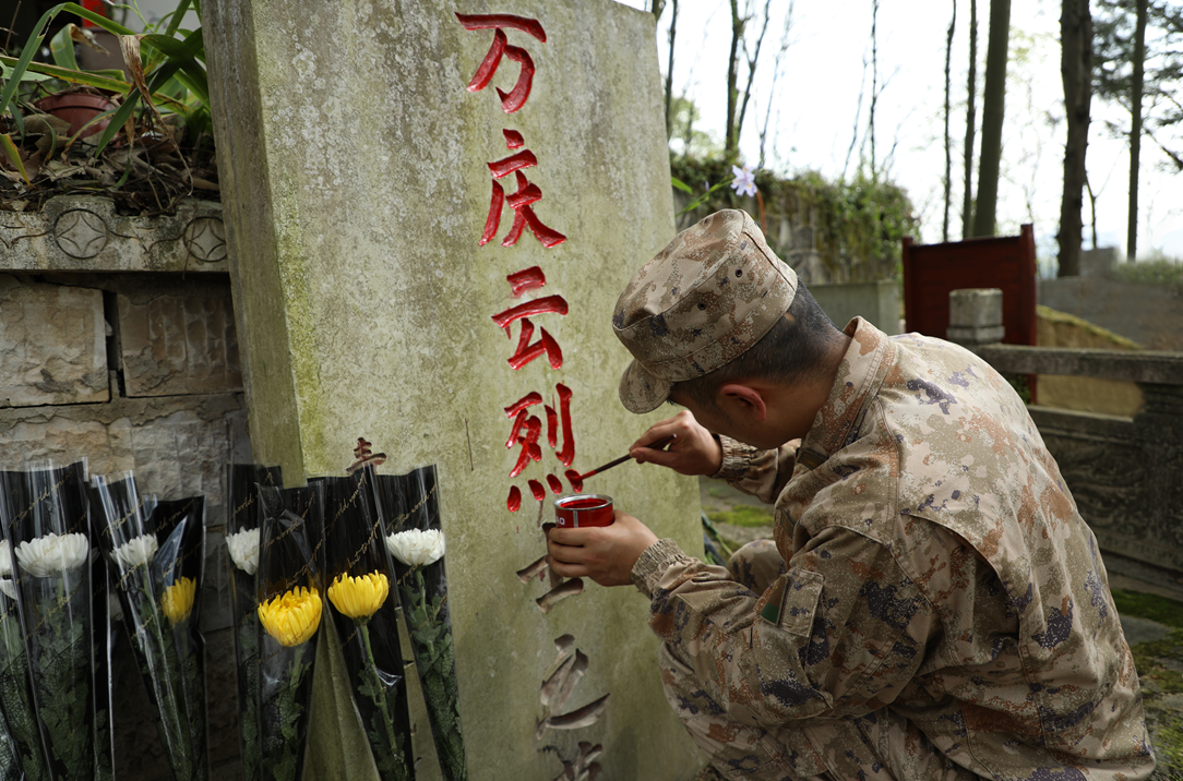 活动最后,区人武部与军代室代表共同为烈士墓碑描红。一笔一划间,铭文重新焕发光彩,这既是对烈士英名的细致描摹,更是对革命精神的传承与铭记。