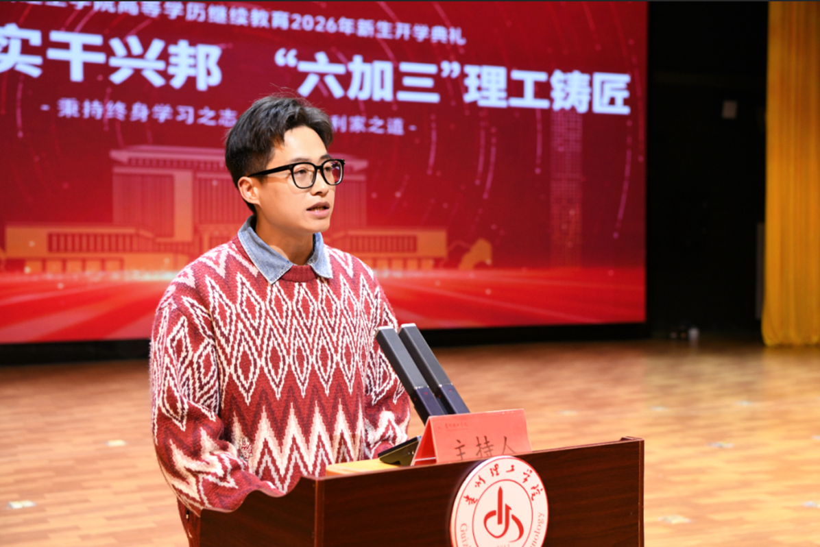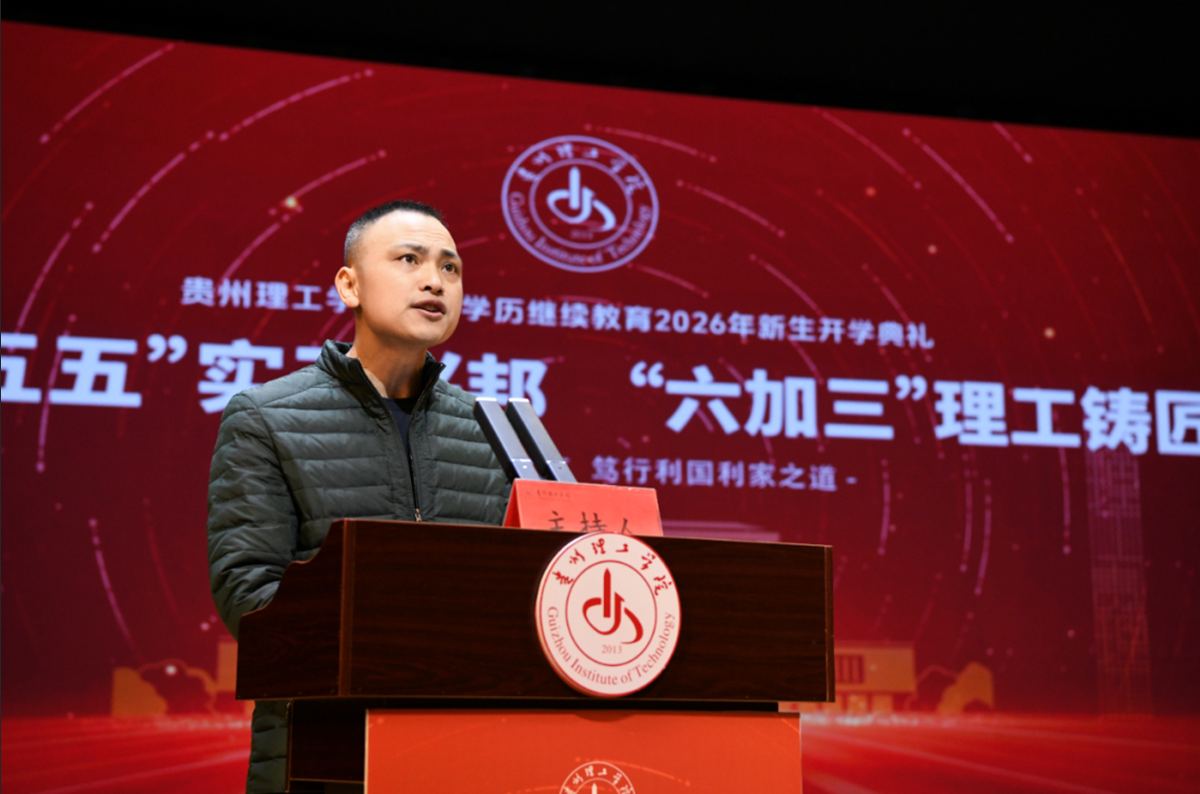 上午10时整,典礼在雄壮的《义勇军进行曲》中拉开帷幕,全体人员起立,齐声高唱国歌。黄名正代表学校在典礼上致辞,并向全体新生和嘉宾表示热烈欢迎。他指出,高等学历继续教育是高等教育的重要组成部分,是构建服务全民终身学习教育体系的重要内容,也是贵州理工学院服务学习型社会、学习型大国建设,助力贵州省“6+3”现代产业体系发展,培养理工类人才的责任与使命。他寄语全体新同学:以入学为新起点,践行“知行至善、厚积薄发”校训,秉持实干精神锤炼专业本领,主动学习运用人工智能等新技术新工具,将个人成长融入国家与地方发展大局,努力成长为契合时代需求的工程科学研究和工程技术创新人才。