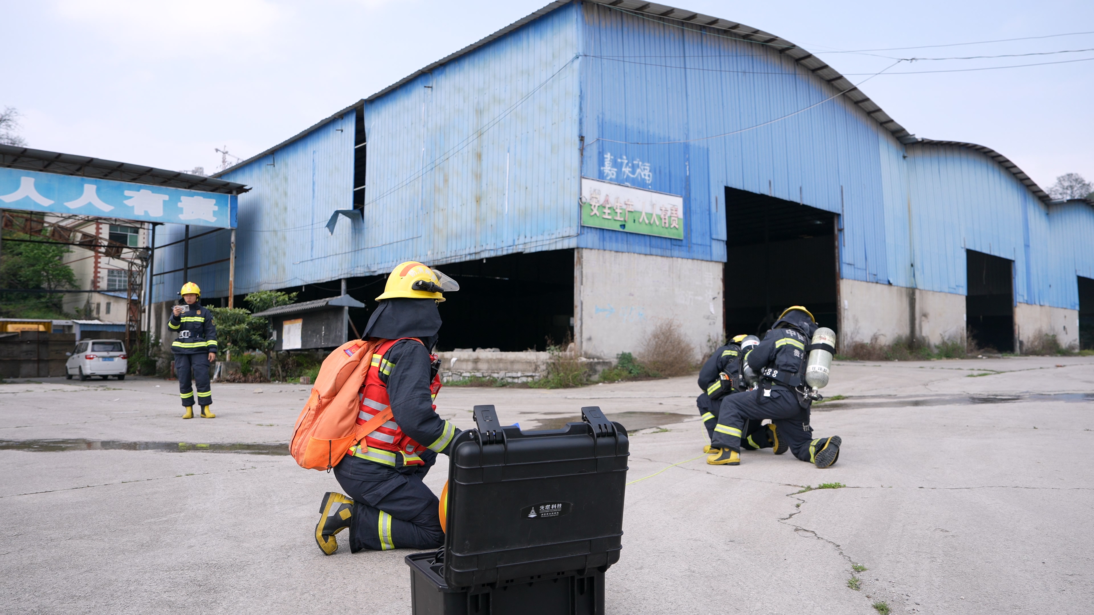 演练模拟辖区大跨距大空间仓库因电气线路故障,引燃堆放的可燃货物及易燃液体,火势迅速向建筑纵深蔓延,形成大面积燃烧,产生大量高温浓烟,对建筑钢结构安全构成威胁,内部少量作业人员需紧急疏散,无人员被困。接到报警后,云岩区消防救援大队立即启动应急预案,调派三桥南路、迎宾路惠源南路消防救援站赶赴现场处置。到达现场后,指挥员迅速组织火情侦查,利用无人机高空侦查、内部侦察小组抵近侦察,全面掌握火源位置、燃烧物质、蔓延方向、建筑结构、内部通道、人员分布等情况。