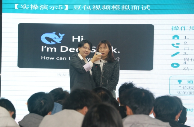 活动中,讲师结合实战经验,围绕岗位分析、简历优化、面试模拟等模块,系统讲解了AI工具在求职全流程中的实战应用方法,并现场演示了豆包、DEEPSEEK等AI工具的操作流程,帮助学生更直观地理解如何借助AI提升求职效率。