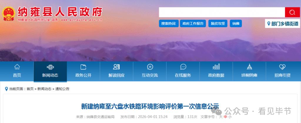 4 月 1 日,沪昆铁路客运专线贵州有限公司委托中国铁路设计集团有限公司,开展 " 新建纳雍至六盘水铁路 " 的环境影响评价工作,对相关内容进行了公示。