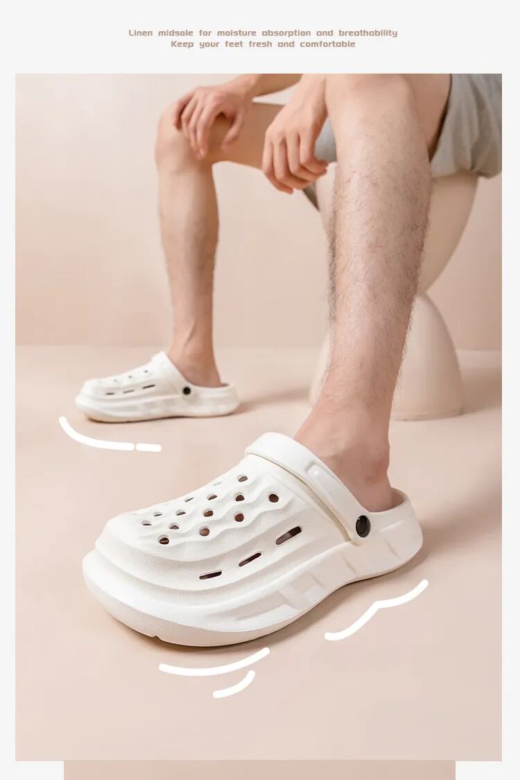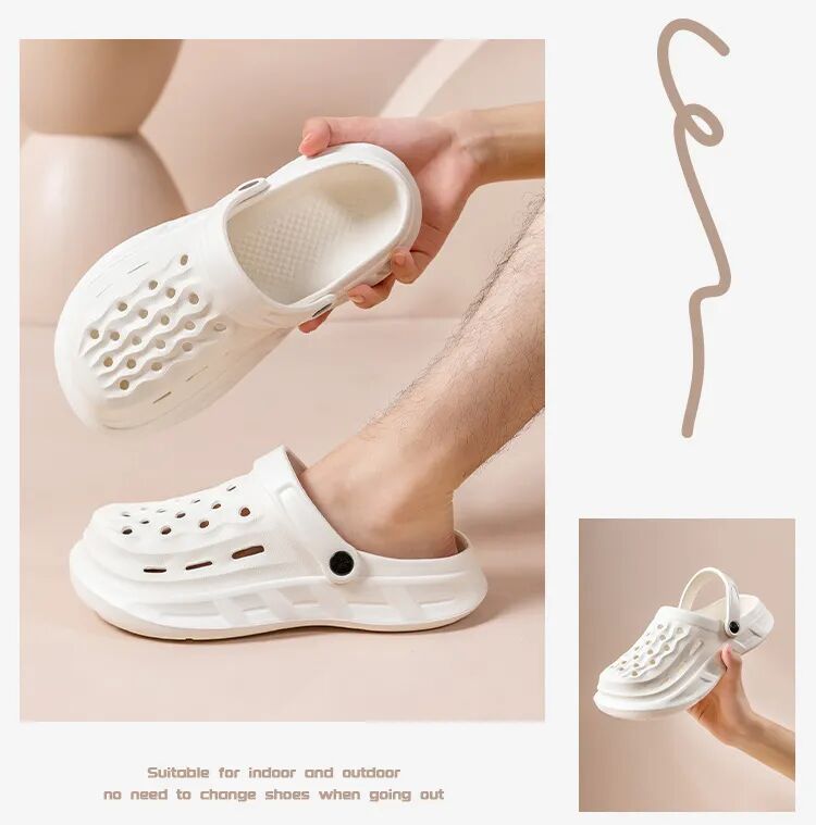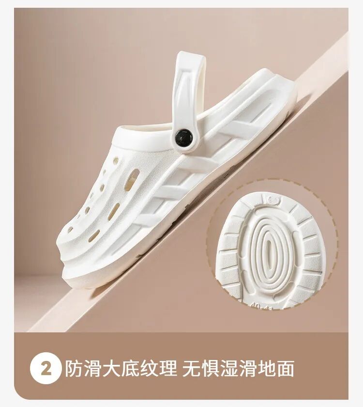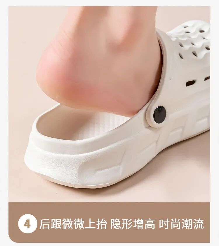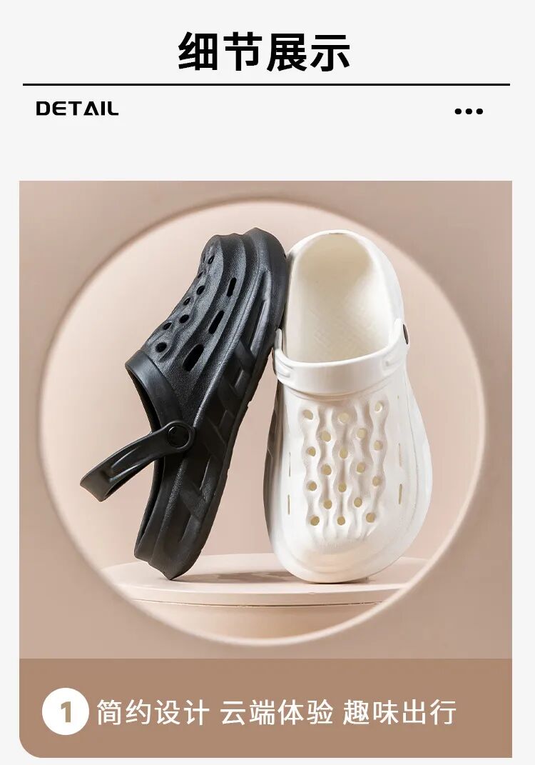 鞋面满满透气镂空孔,空气循环超顺畅,夏天脚爱出汗也不怕,汗液快速散发,不闷脚、不捂汗、不臭脚。光脚穿也清爽,洗澡、玩水、雨天穿都不怕积水,干爽舒适一整夏,汗脚星人必备!