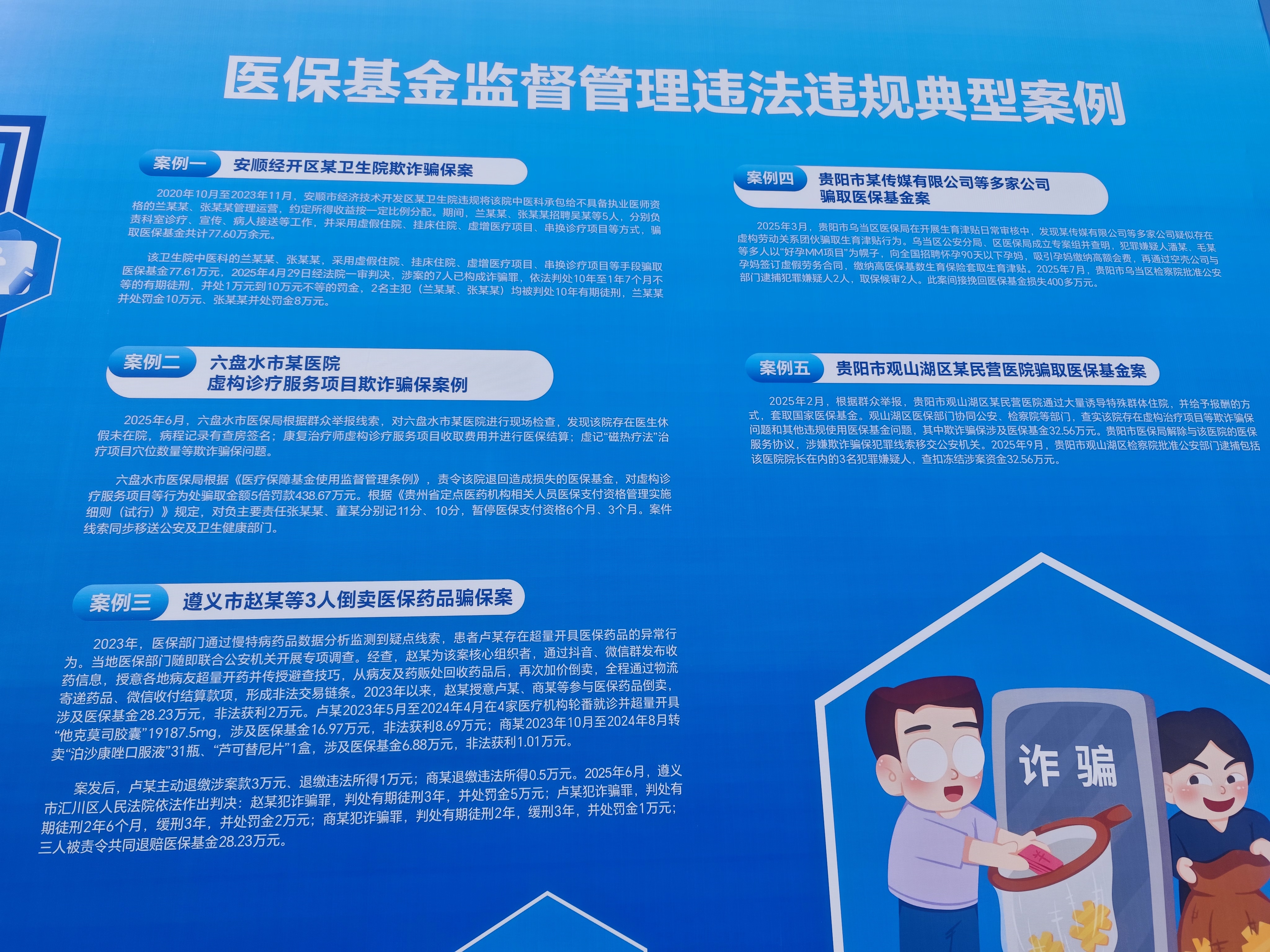 安顺经开区某卫生院欺诈骗保案、遵义市赵某等3人倒卖医保药品骗保案、贵阳市某传媒有限公司套取生育津贴案,以及贵阳市观山湖区某民营医院骗取医保基金案等案件。这些案件的查处,不仅有效挽回了医保基金损失,更对心存侥幸的不法分子形成有力震慑,切实守护群众“看病钱”“救命钱”。