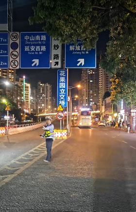 约20分钟后,周庆带着维修人员来到现场为旅游大巴轮胎充气。为确保安全,民辅警3人护送大巴车倒出匝道,并引导其前往花溪大道太慈桥方向调头驶离。