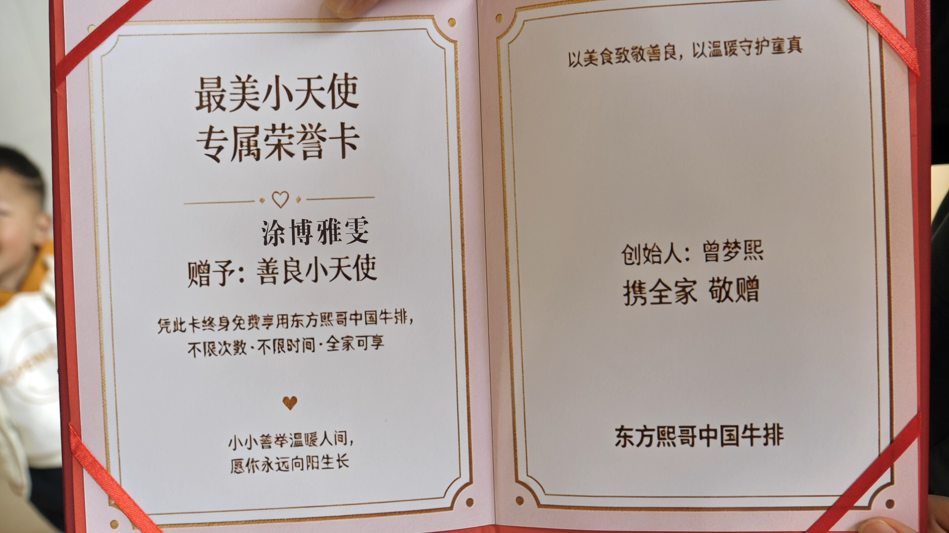 在学校的表彰现场,曾孟熙激动地将一张特殊的“VIP卡”递到涂博雅雯手中。他承诺,这是一张终身免费的牛排卡,只要自家店铺还在营业,涂博雅雯和她的家人随时可以来免费享用牛排。