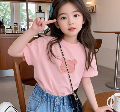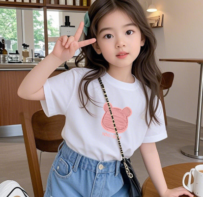 胸口有一只憨态可掬的小熊,不是那种大面积的夸张印花,而是小小的、精致的刺绣或胶印。小熊歪着脑袋,戴着蝴蝶结或者抱着一颗小爱心,细节满满。女儿穿上后会很得意地指着胸前说:“妈妈你看,小熊!”这种小设计不会太幼稚,幼儿园穿可爱,小学穿也合适。