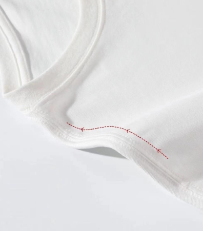 领口做得很细致。圆润的弧度刚好贴合颈部,不勒不紧,但也不会松垮到露肩膀。领口的罗纹包边做了加固,多次机洗不容易变成“荷叶边”。前后领高一致,不会遛背。袖子是微宽松的小飞袖或直筒袖,把手臂上肉肉的地方藏起来,举手投足都自在。