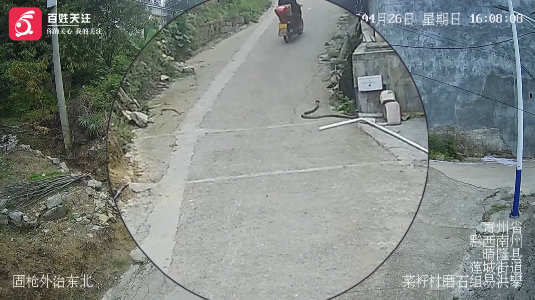 贵州省生物研究所副研究员 吕敬才:正常情况下,眼镜王蛇不会主动攻击人类。只有自身近距离受到惊扰、感受到生命安全威胁时,才会做出防御反击。视频里摩托车突然驶来,噪音大、距离近、震动强,蛇瞬间受到惊吓,误以为遭遇攻击,做出反击姿势。市民遇到此类蛇,应当远离。